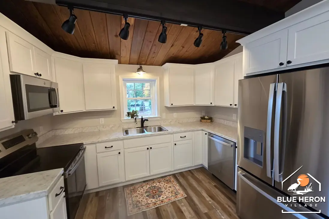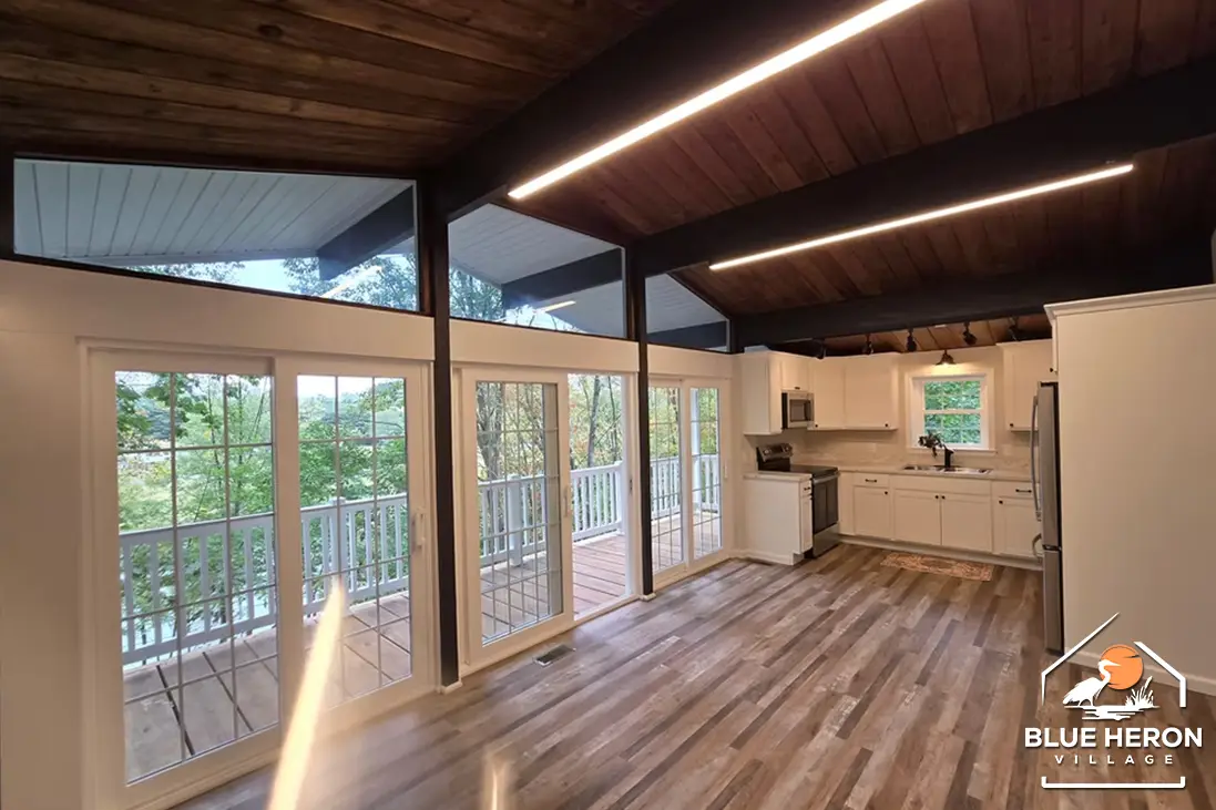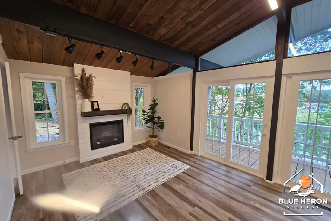 A cozy lake-view cabin with three bedrooms, two baths, and open living spaces. Enjoy double decks, a fireplace, and a wooded lot with plenty of outdoor charm. Perfect for peaceful living at Blue Heron Village.