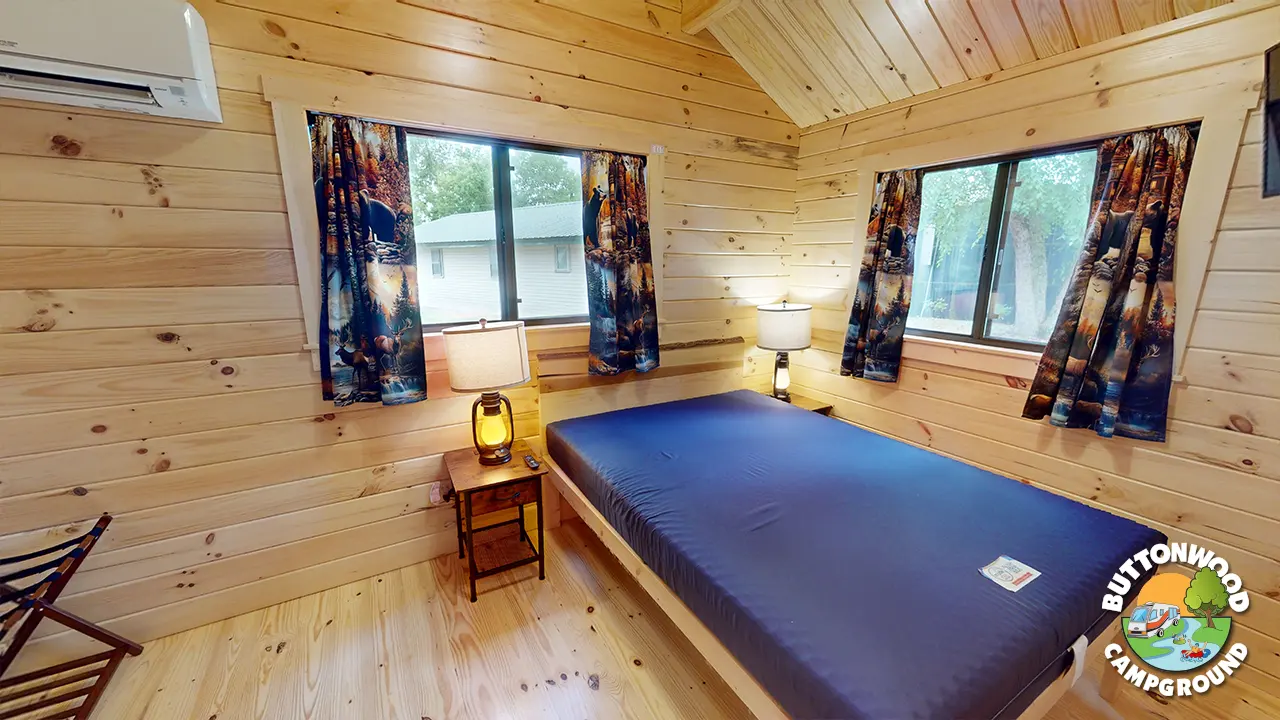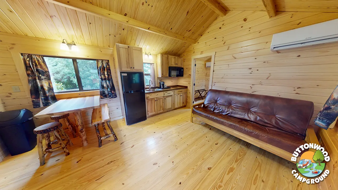 Deluxe Cabins offer enhanced comfort with log furniture, bath with shower, porch glider, kitchenette, cable TV, and mini splits with Heat and A/C. Sleeps 4–6 with a separate bedroom and additional bunk beds and futon. These cabins are a great mid-level choice for families who want cabin comforts plus a cozy, cabin-style feel at Buttonwood.